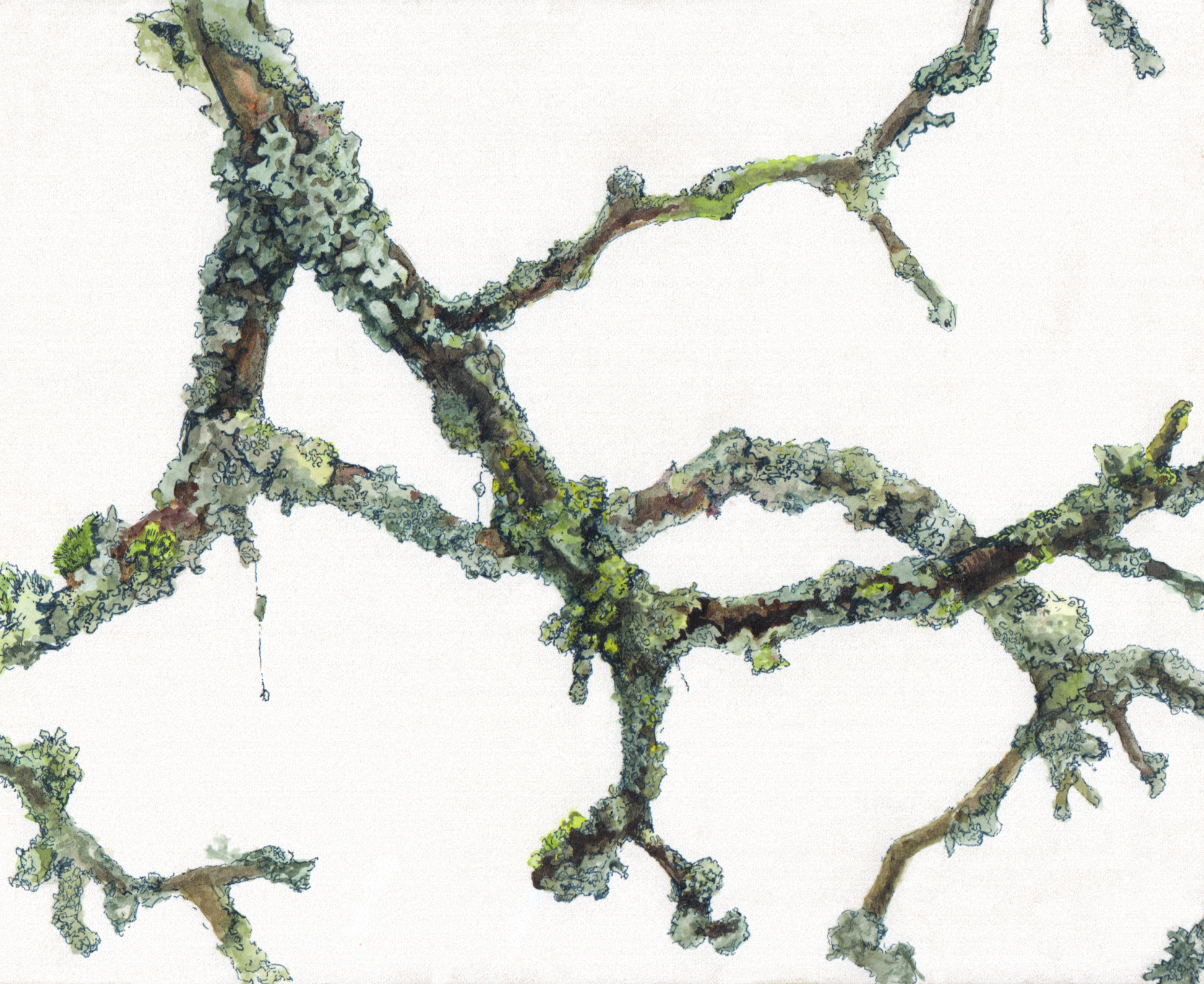 At a thematic residency at the Gibraltar Point Centre for the Arts, on the Toronto Islands, I was fascinated by the colourful lichen encrusted twisted branches and twigs of the honey locust in front of my temporary home. In dry weather the tree’s bark appears a mottled dull bluei-sh green from the thick layer of lichen.