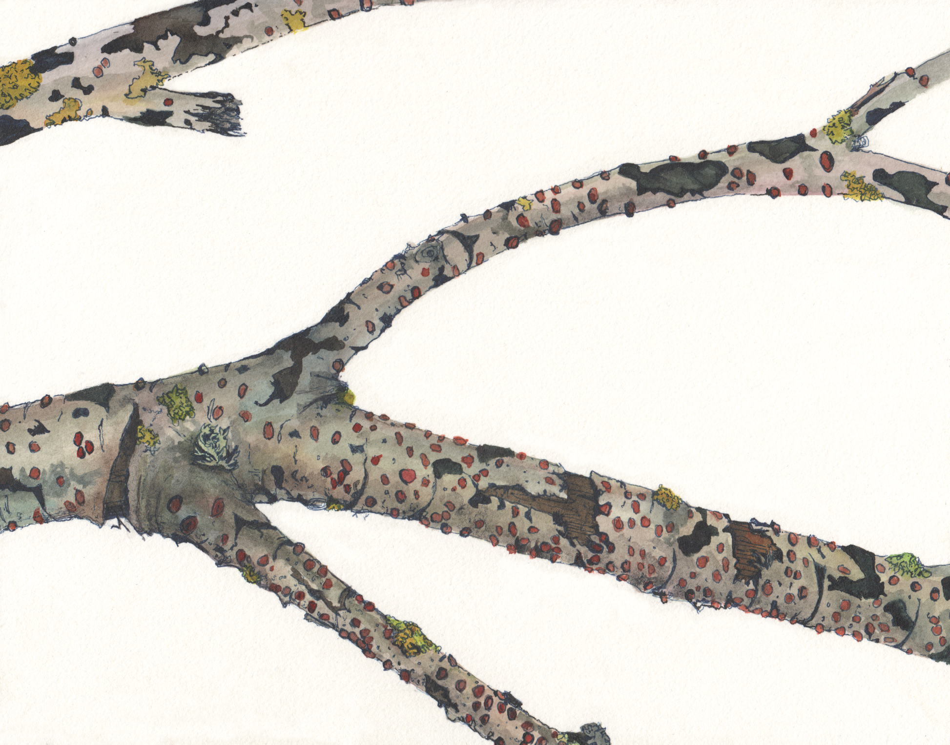 A chance discovery during a camping trip at Sleeping Giant Provincial Park near Thunder Bay. Fallen branches of birch near our campsite, collected for use as kindling, were polka-dotted with red fungi dots. Later searches for similarly spotted wood came up empty.
