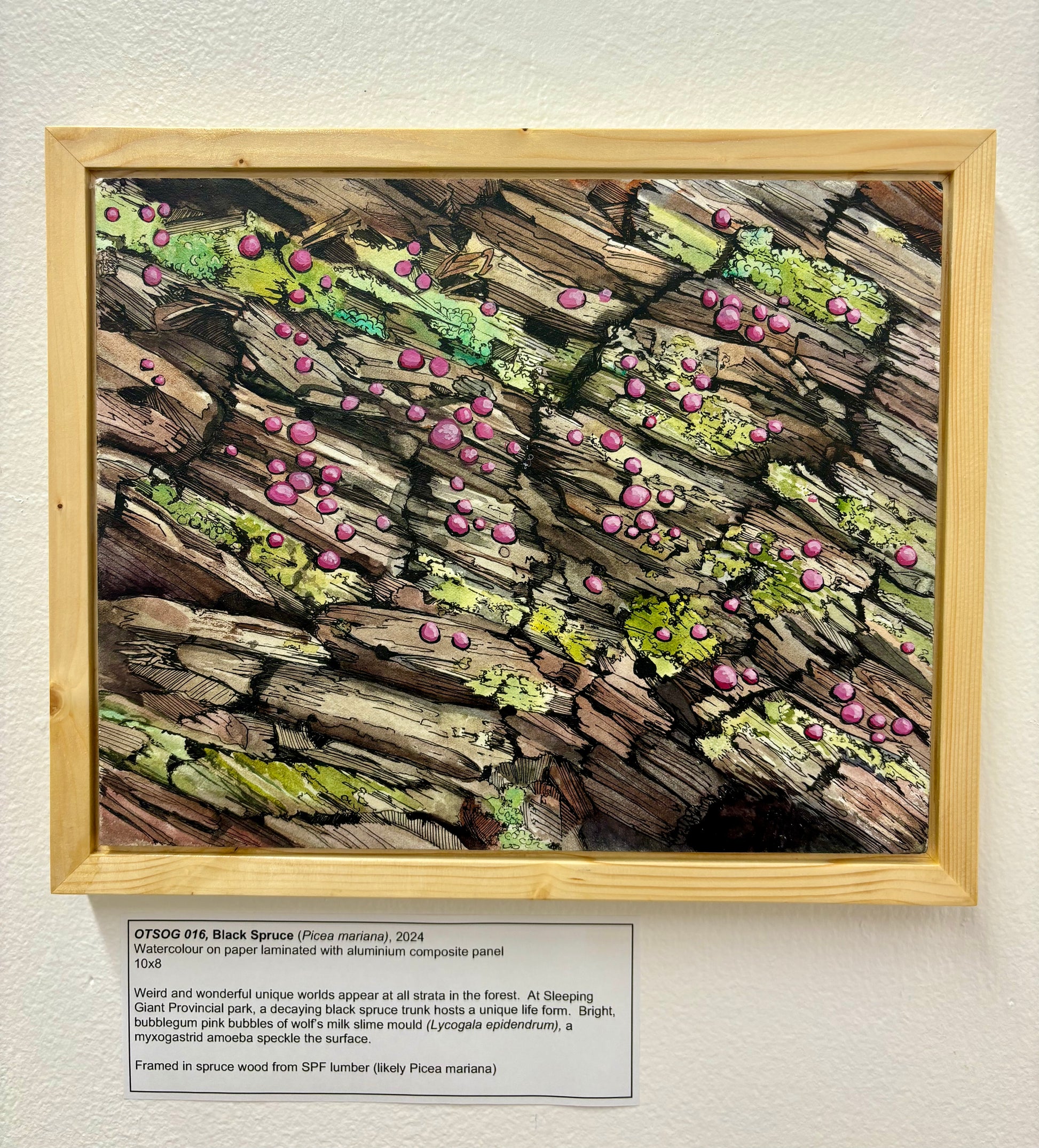 Weird and wonderful unique worlds appear at all strata in the forest. At Sleeping Giant Provincial park, a decaying black spruce trunk hosts a unique life form. Bright, bubblegum pink bubbles of wolf’s milk slime mould (Lycogala epidendrum), a myxogastrid amoeba speckle the surface.